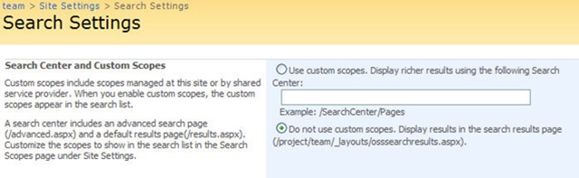 Now change the setting to use custom scopes, and enter the following relative URL /SearchCenter/Pages (as per the example on the page). See below.